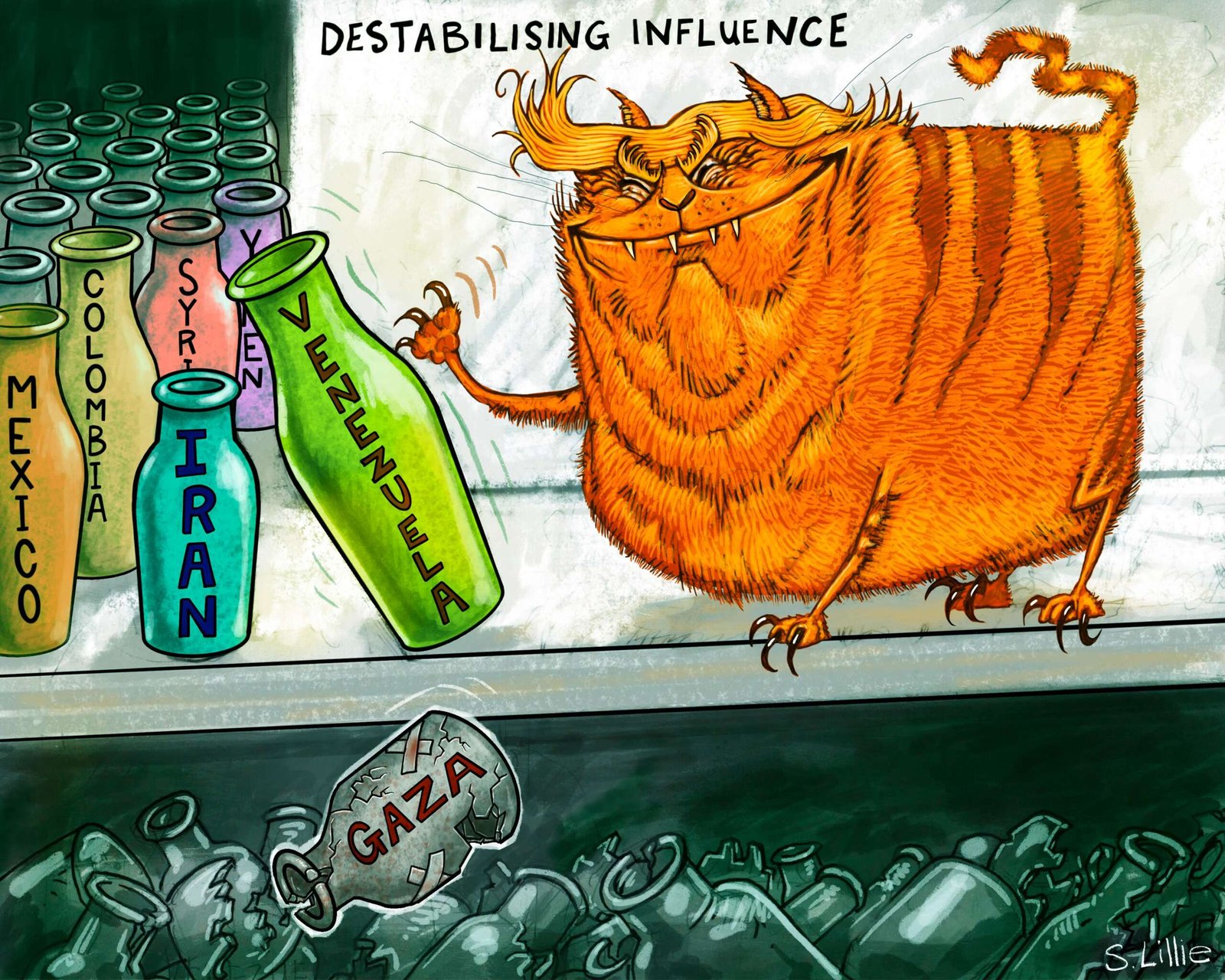 بحسب الكاريكاتير، ترجو الإدارة الأمريكية أن يصل تأثير هذا المخطط المزعزع للاستقرار إلى إير…